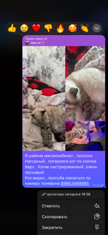 В районе мясокомбинат , поселок Нагорный , потерялся кот по кличке Барс .