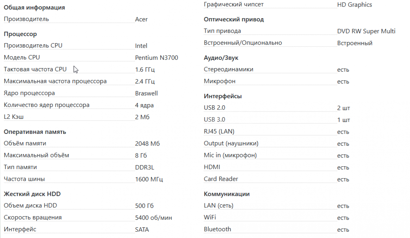 Продам 15.6" Ноутбук Acer Aspire ES 15 ES1-531-P81V (HD) Pentium N3700(1.6)/2048/500/IntelH